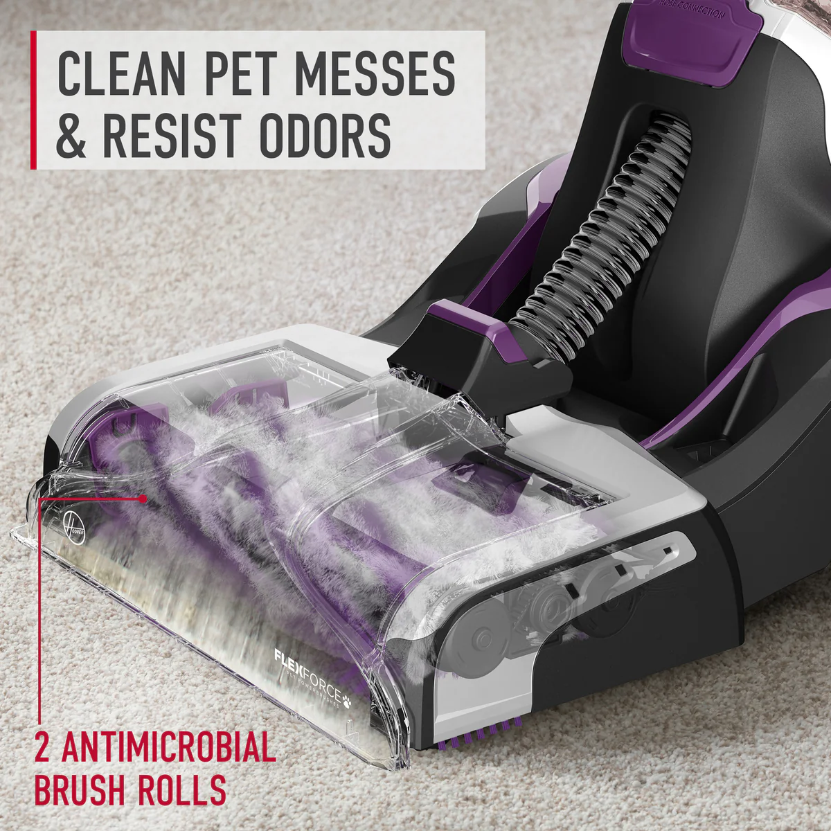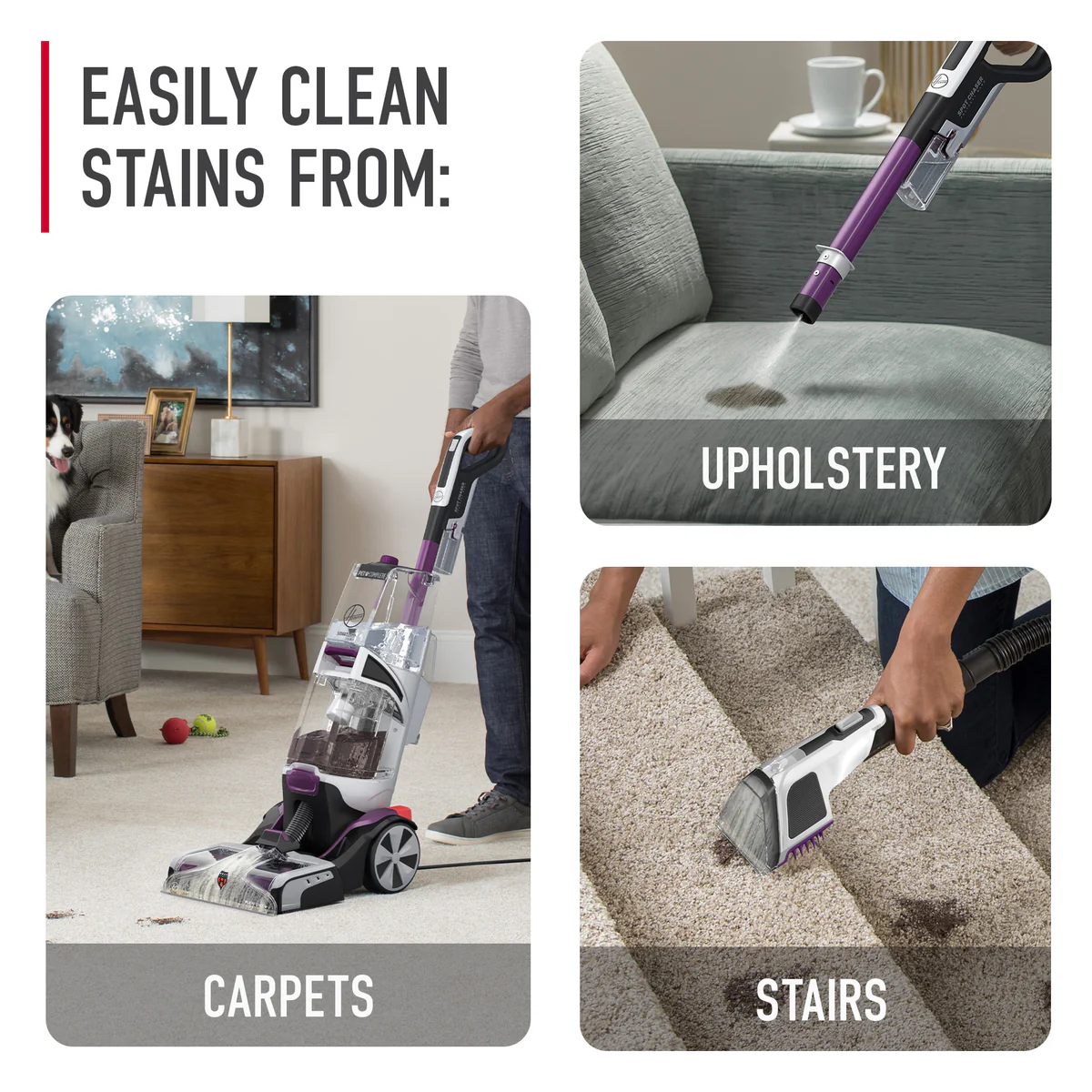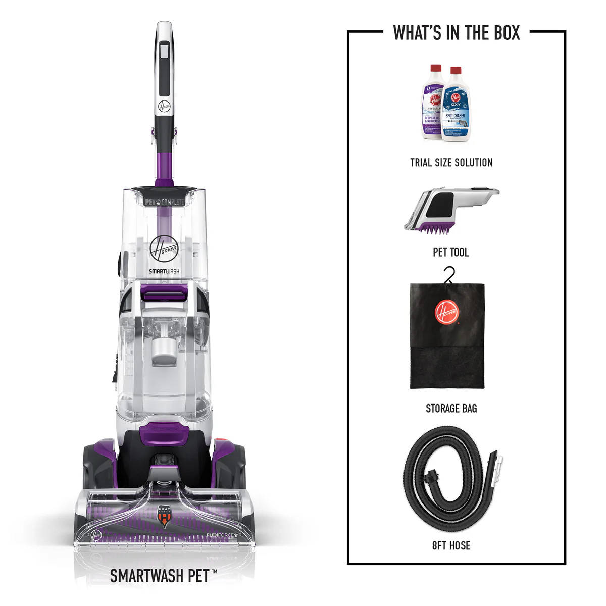The Hoover® SmartWash™ PET Complete Automatic Carpet Washer is just as easy to use as our original SmartWash. Simply push forward to clean and pull back to dry. No trigger, and no mixing solutions. It’s literally as easy as vacuuming. And the SmartWash™ PET Complete is designed specifically for homes with pets. Use the Spot Chaser™ Pretreat Wand to pretreat stains before you clean or as you go. Plus, the antimicrobial FlexForce Pet PowerBrushes remove deep-down dirt while resisting pet odors. For those pet stains on stairs or furniture SmartWash™ PET Complete comes with an antimicrobial scrubbing tool.